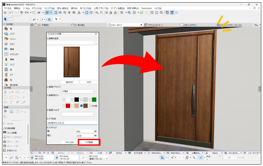 Web上のドア画像をそのまま取り込んで配置できるようになりました。カタログやメーカーサイトの画像を直接活用でき、素材探しの手間を省けます。