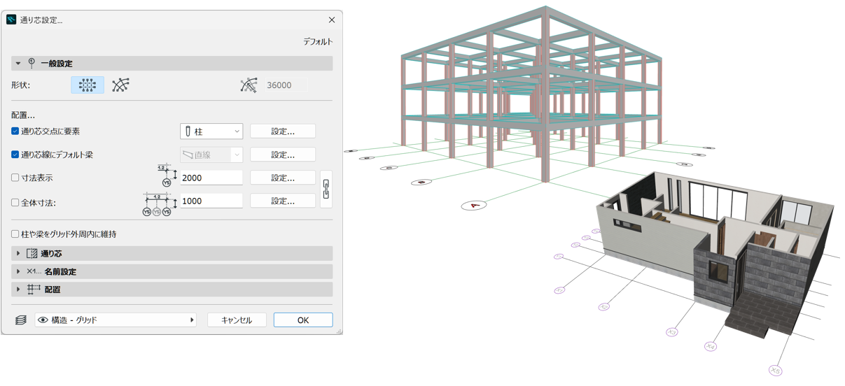 柱・壁・梁を正確に入力するための基準線の作成が行えます。2D・3D画面でもグリッド表示、スナップに対応し、通り芯交点や線上に柱・梁の自動配置も行えます。
