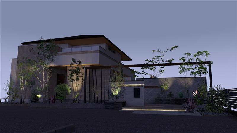 | 安田「お手入れが大変なので、植栽を少なくしたいというご要望はあります。その時は、エクステリアデザインにとっての植栽の必要性、また人に与える気持ちのお話までさせてもらい、最終的にご納得いただいたうえで、少しのポイントで取り入れるなど工夫します。それと、ナイトシーンの演出はこだわっています。夜の照明で外構の印象はがらりと変わるので、電気科出身としては譲れない部分でもあります(笑)ナイトシーンを実物の雰囲気に再現するのはとても難しいですが…でも、絶対に照明提案はするようにしています。」 |
