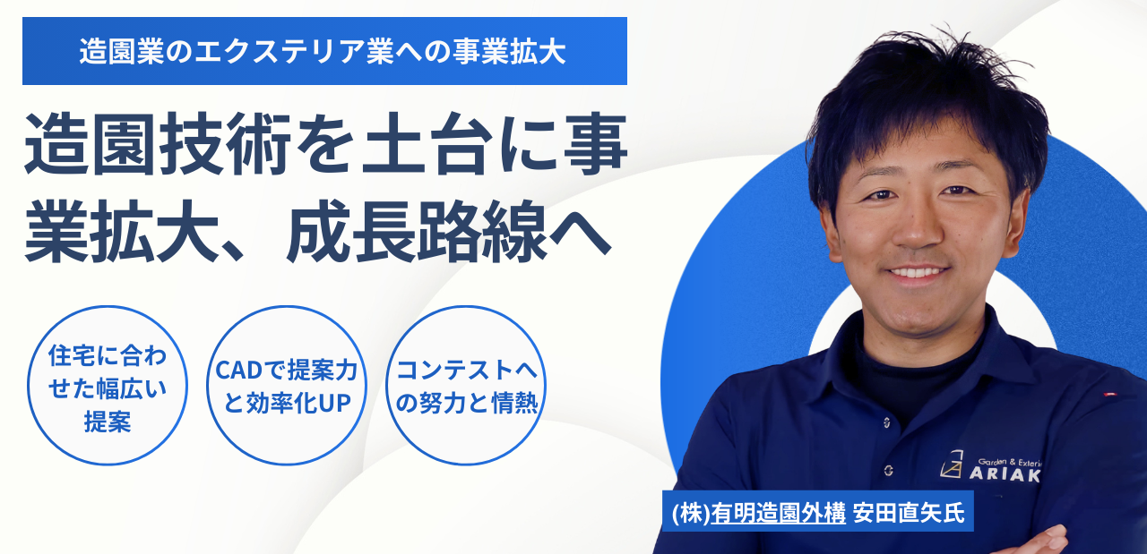 | 安田「CADのことだけではなく、エクステリア業界のことを親切丁寧に教えてくださる営業マンが来てくれたんです。“この人から教わりたい”と思ったのが決め手でした。CADはあくまでもツールであって、使うのは人である自分自身。だからこそ、信頼関係が築けると思えた「人柄」で選びました。」 |